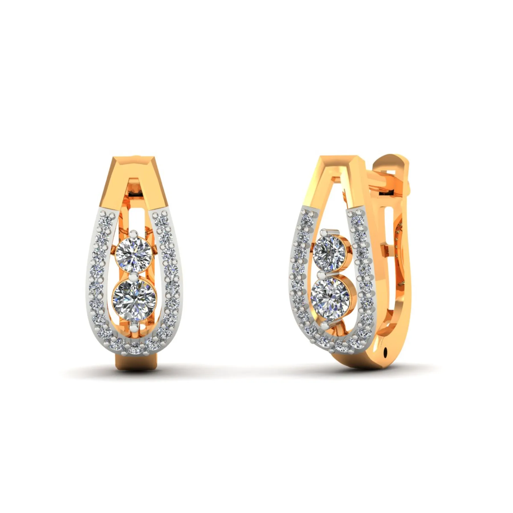 The Classic Bali hoop is rendered in luminous dual-tone gold. The sleek, modern design features two brilliant center diamonds framed by delicate pavé accents. Meticulous white gold detailing maximizes the light and delivers exquisite sparkle. An elegant, secure huggie style, offering enduring sophistication for everyday luxury.