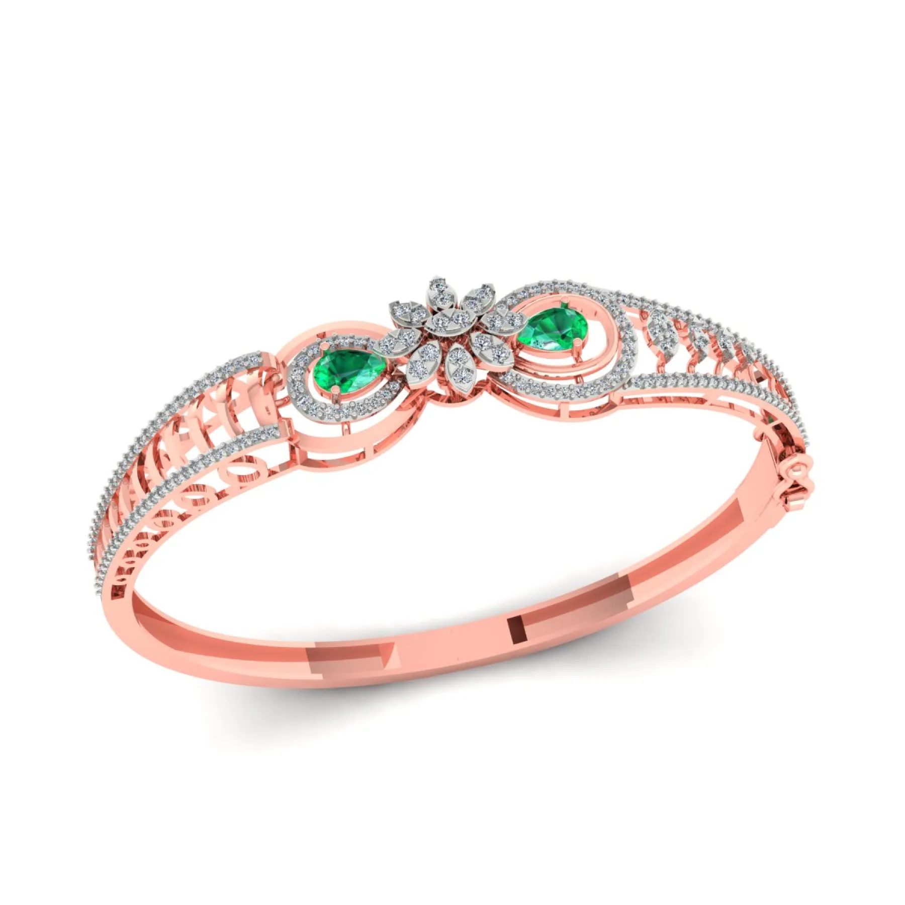 This Elite Ladies Kada is an exquisite expression of modern femininity. Crafted in radiant rose gold, the sculptural design features intricate lattice detailing along the shank. The centerpiece is a dazzling floral motif, framed by marquise green emeralds and brilliant diamonds. A luxurious and sophisticated hinged bangle designed for maximum visual impact.
